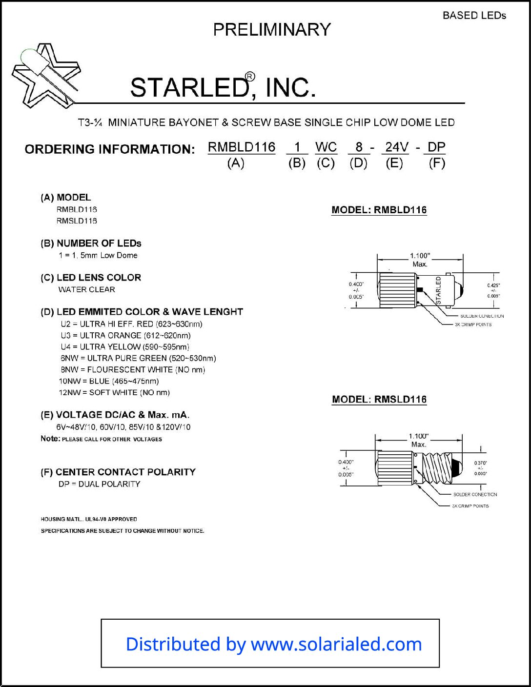 | Low Dome Miniature Bayonet Base (Ba9s), Single Chip LED, T-3 1/4, High Intensity LED, Dual Polarity, Long Life, 50,000 hours | |